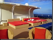 20-10-10 (1)The weather has been good today. After a cloudy start the sun has been out and forced the mercury up in to the low twenties. We sunbathed in the morning up on the front of the ship on the top - sixteenth deck no less. Another compliment about this ship - the deck furniture is fantastic, not your usual plastic sun beds but a mix of traditional wooden steamers, actual sun beds with mattresses which can be pushed together for a romantic interlude (we kept ours apart!) and lovely cane chairs and sofas too.